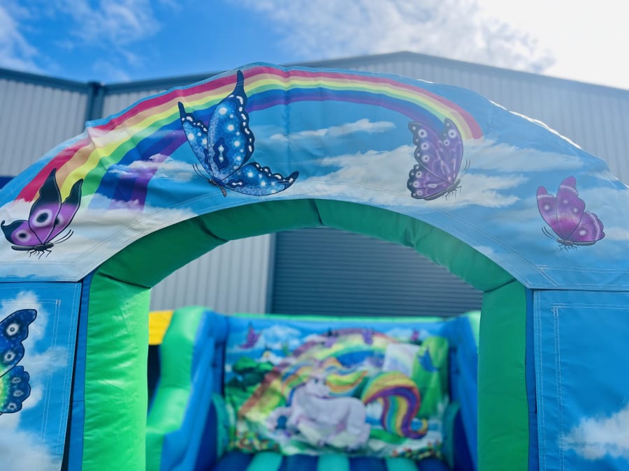 Unicorn themed play park includes two slides either side of the bouncy castle, a ball pool with air jugglers and a place for the unicorn soft play.